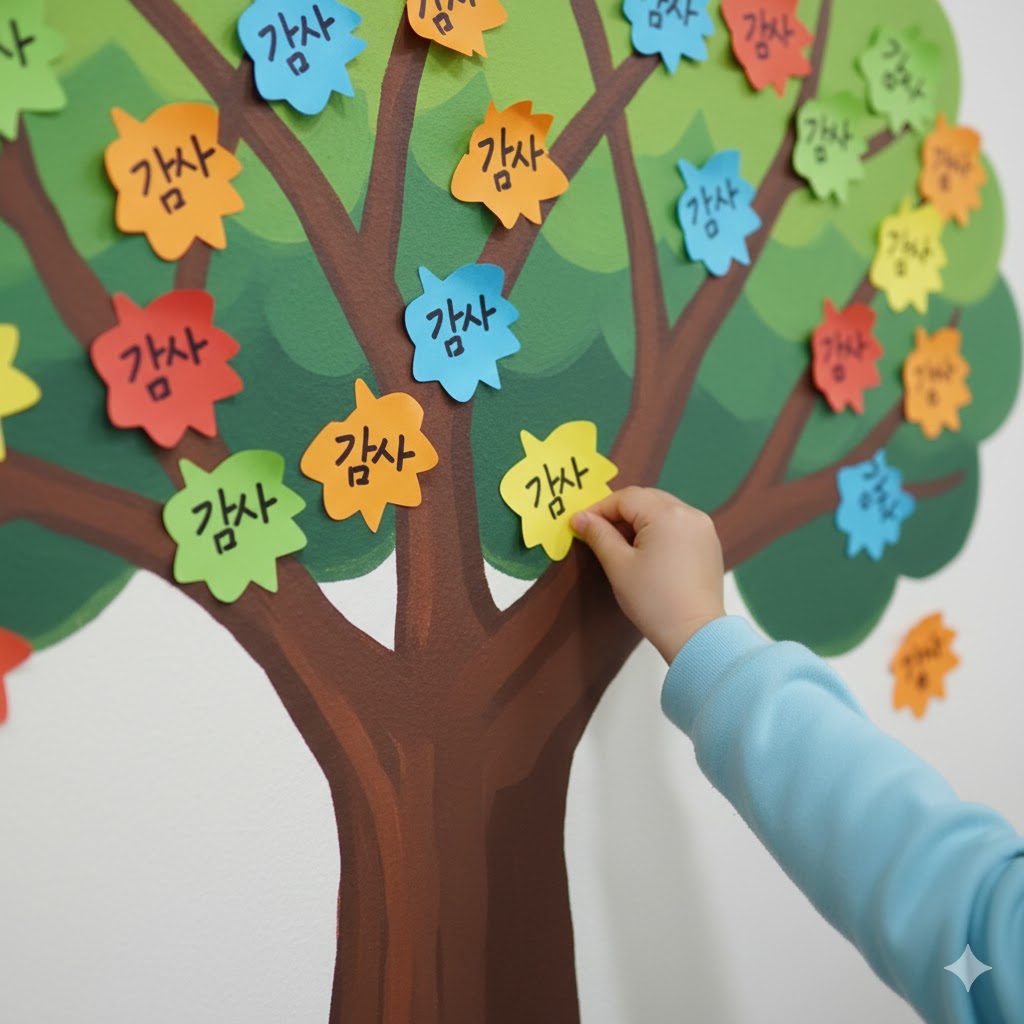 - 방법: 큰 종이나 캔버스에 나무 모양을 그리고, 가족들이 돌아가면서 감사했던 제목을 적은 나뭇잎 스티커를 붙여 **'감사 나무'**를 완성합니다.