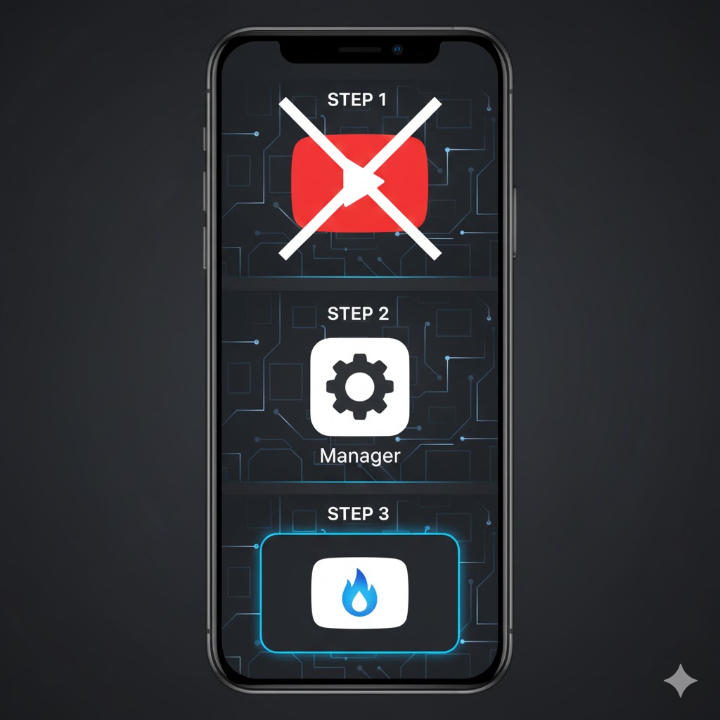 - 수동 방법: 만약 자동으로 인식을 못하면, 인터넷에서 매니저가 요구하는 정확한 버전의 유튜브 APK 파일을 다운로드하여 스마트폰 저장소에 준비해 둡니다.